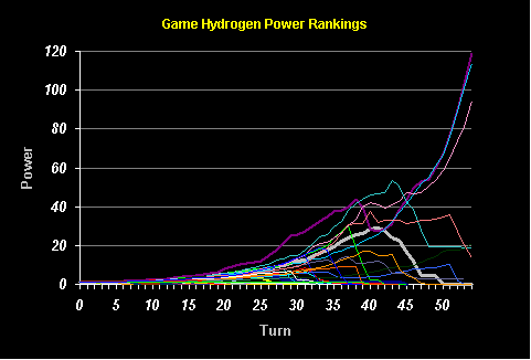 Eniac and Therminators attacked Pendragon at turn 44. It turned out that Pendragon, despite having been warned and having an overwhelming production capacity, had not managed to build up capital fleets. Instead he seemed to be in favour of building bombers(one of them having mass 900!). Eniac and Therminators flooded the Pendragon system with a fleet of small units combined with a few capital fleets. Surprisingly, Pendragon simply gave up after the first massive attack. In the absence of any other real challenge the allies could quickly eliminate the remainders of Pendragon.